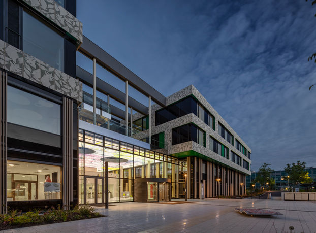 Die zentrale zweigeschossige Eingangshalle mit gedecktem, wettergeschütztem Eingang bietet in Kombination mit den vielfältigen Blickbeziehungen intuitive Orientierbarkeit für PatientInnen und BesucherInnen. Schon beim Betreten des Klinikums werden BesucherInnen mit einer offenen und hellen Atmosphäre empfangen, die Einblicke in das Leben der Klinik und die Labore bietet.
