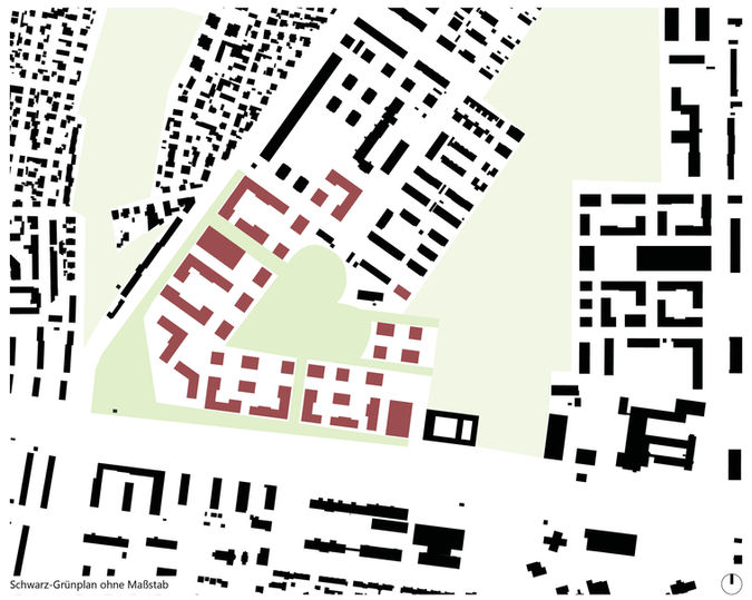 Die entstehenden Baufelder werden mit einer Blockstruktur bespielt, die zum Grünraum in der Mitte (zum Grünen Herzal) aufgebrochen und gestaffelt ausgeführt wird. Dies ermöglicht es, zum einen weitläufige Sichtbezüge innerhalb des Quartiers zu gewährleisten und die Bebauung zum anderen schlüssig in die umliegende Stadtstruktur einzugliedern.